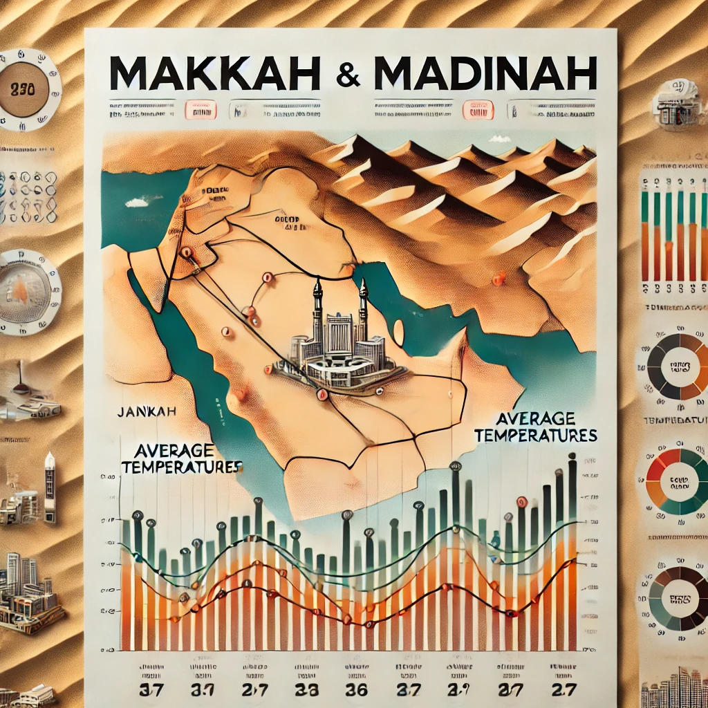 Untuk membantu Anda memvisualisasikan prakiraan cuaca ini, kami menyediakan grafik suhu rata-rata di Makkah dan Madinah sepanjang tahun. Grafik ini menunjukkan perubahan suhu dari bulan ke bulan, membantu Anda merencanakan waktu terbaik untuk melakukan perjalanan ibadah.